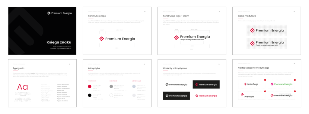 W projekcie systemu identyfikacji wizualnej dla Premium Energii znalazła się Księga identyfikacji wizualnej, opisująca konstrukcję logo wraz claimem, pole ochronne, rozmiary minimalne, typografię i kolorystykę.