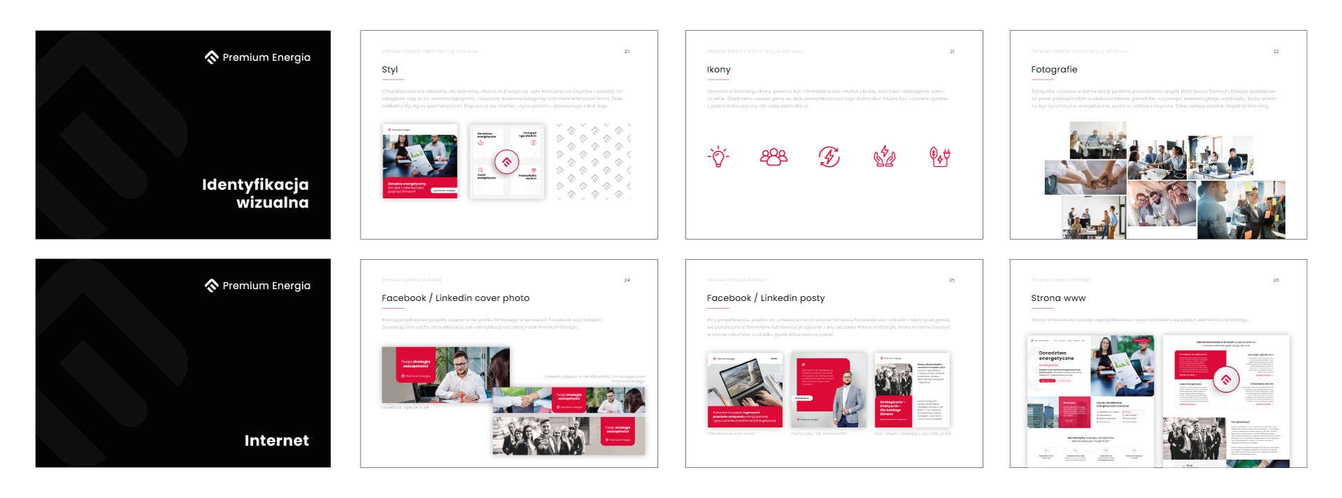 W projekcie systemu identyfikacji wizualnej dla Premium Energii znalazła się Księga identyfikacji wizualnej, opisująca konstrukcję logo wraz claimem, pole ochronne, rozmiary minimalne, typografię i kolorystykę.