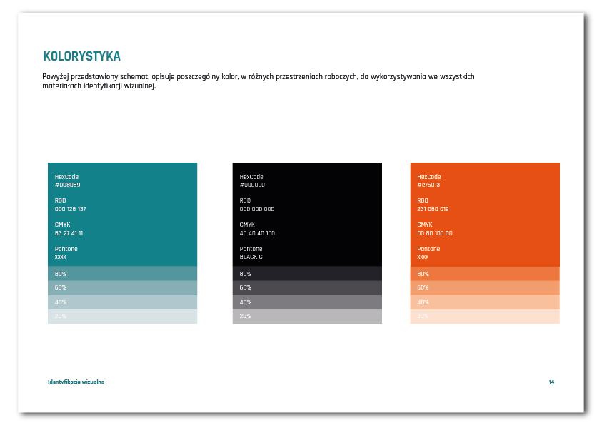 - Wprowadzono również kolor uzupełniający (pomarańczowy: Hex #e75013, CMYK: 0 80 100 0, RGB: 231 080 019), stosowany m.in. w stylizacji nagłówków.