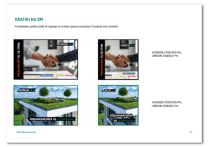Nowy system wizualny został natychmiast zaimplementowany w kluczowych materiałach firmowych, w tym w projektach wizytówki, stopki mailowej i papieru firmowego. Brandbook zawiera również szczegółowe wytyczne dotyczące materiałów dla mediów społecznościowych (awatary, zdjęcia w tle dla Facebooka i LinkedIn) oraz przykładowe grafiki postów.