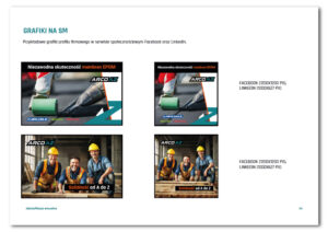 Nowy system wizualny został natychmiast zaimplementowany w kluczowych materiałach firmowych, w tym w projektach wizytówki, stopki mailowej i papieru firmowego. Brandbook zawiera również szczegółowe wytyczne dotyczące materiałów dla mediów społecznościowych (awatary, zdjęcia w tle dla Facebooka i LinkedIn) oraz przykładowe grafiki postów.